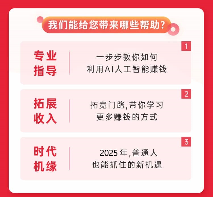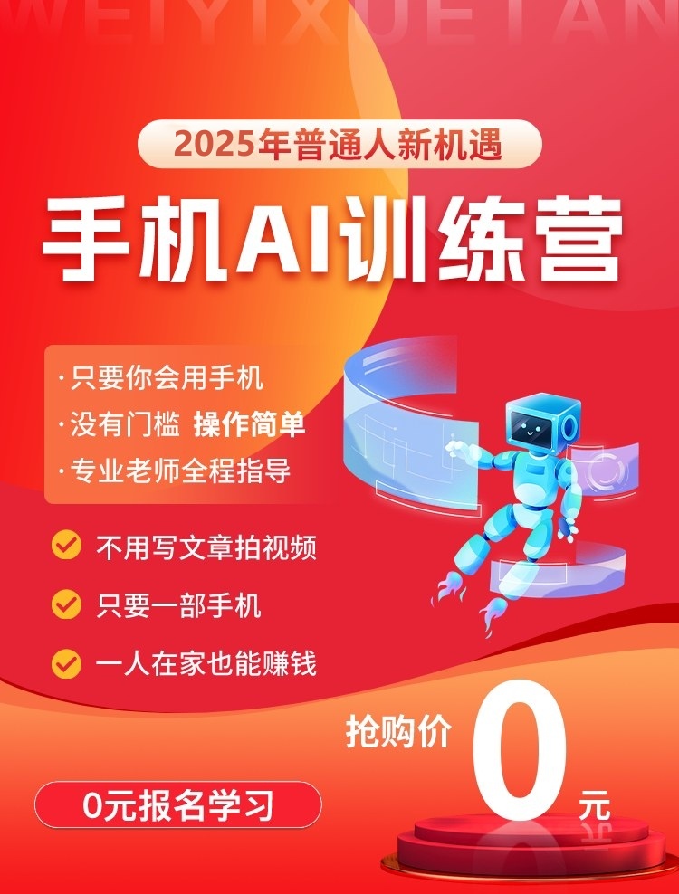 您好!欢迎来到2025年赚钱新风口,只需一部手机就能操作。参加AI人工训练营,回答以下几个问题,即可0元领取课程。